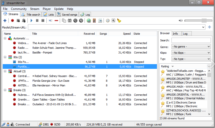 streamWriter is a feature-rich Internet radio client with the ability to record both the played stream and any number of other stations simultaneously. The program includes a searchable browser for thousands of available sources of every kind (rock, rap, talk, sports, etc.), an audio splitter that looks for silence to separate tracks, and includes a basic player for recorded files. The program supports scheduled recordings, audio file wish list and block list, and equalizer. Also allows connections with the streamWriter community to report on available radio streams.