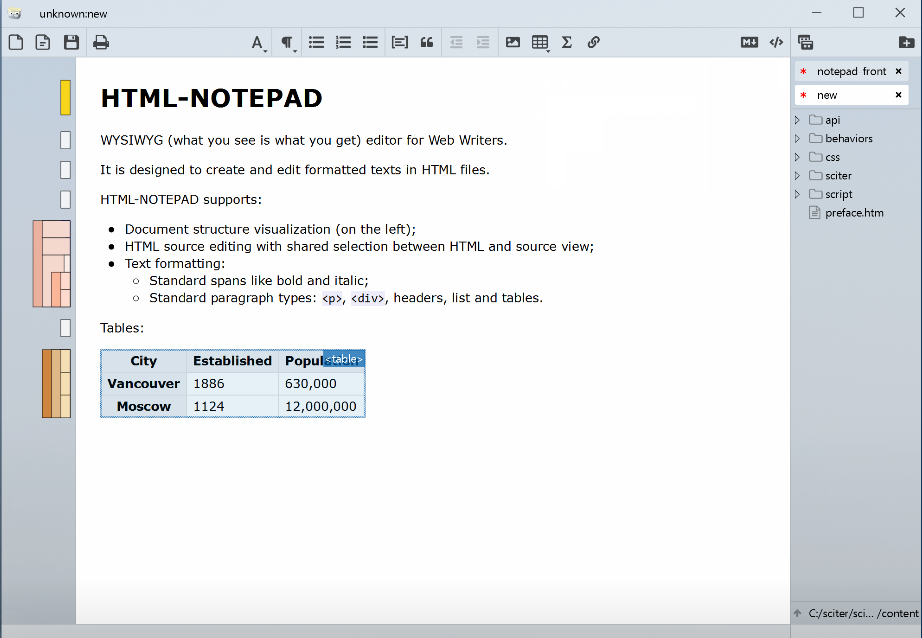 A WYSIWYG editor of structured documents: texts that have hierarchical and semantically meaningful structure, such as headers, lists, tables and so on.