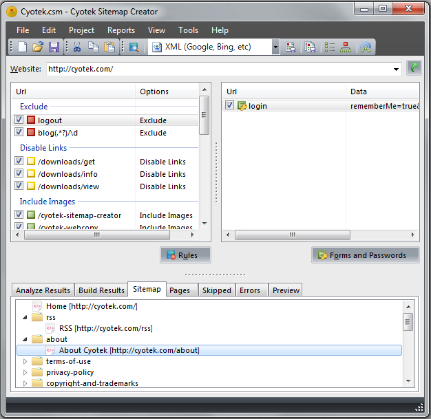 When following redirects after posting form data, all built in skip rules are ignored, so if a post to one site directs to another to complete the post, Sitemap Creator will now always follow the redirect
