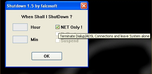 Shutdownwin is a tiny simple tool for timed shutdown, restart or suspend windows. Moreover it can terminate RAS (DialUp, Broadband) connections too. You can terminate the countdown any time by double clicking the tray icon on windows tray bar.