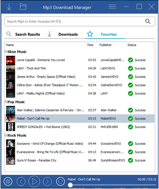 Mp3 Download Manager is a simple application that lets you search for songs, artists, albums - and download them as MP3 directly from the results list, or use URLs in order to extract songs out of online videos.