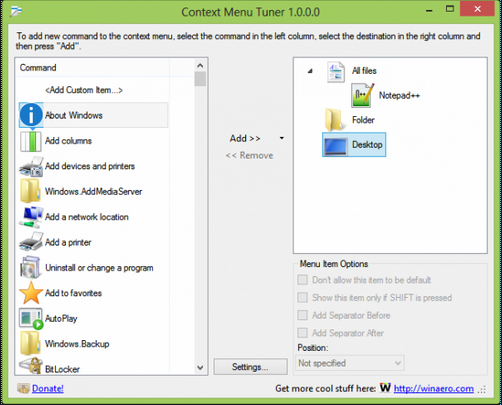 Context Menu Tuner is an application which allows you to customize Explorer's context menu in Windows 10, Windows 7, 8 and 8.1.