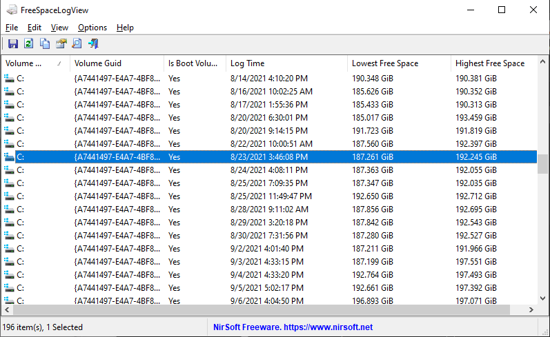 FreeSpaceLogView is a tool for Windows 10 that displays a log of free disk space on your system. This tool only works for NTFS formatted disks. For every log item, the following information is displayed: Log Time, Volume Name, Volume Guid, Lowest Free Space, Highest Free Space, Is Boot Volume (Yes/No).
