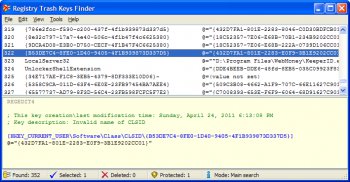 Registry Trash Keys Finder (TrashReg) is an advanced Registry cleaning tool. The main function of RTKF is to allow the removal of unnecessary keys from the Windows Registry. Many programs leave keys in the Registry, even after programs removal using an uninstallation facility provided with the programs themselves. RTKF allows you to decide whether to delete or leave the keys found.