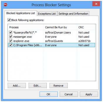 Process Blocker is a simple application giving ability to system administrator to prevent running of any program by user. Process Blocker may be useful in fight against IMs, games or other time-killers on work. The project is in development but usable enough. It is vital to view instruction on the project's web-site.