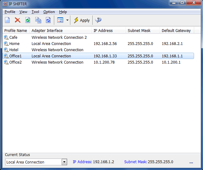 IP Shifter allows you to switch your IP address parameters (e.g. IP address, Subnet mask, Gateway, DNS, Proxy) if you work dynamically at several locations in the network (due to business), or you need to use your computer in more than one network.
