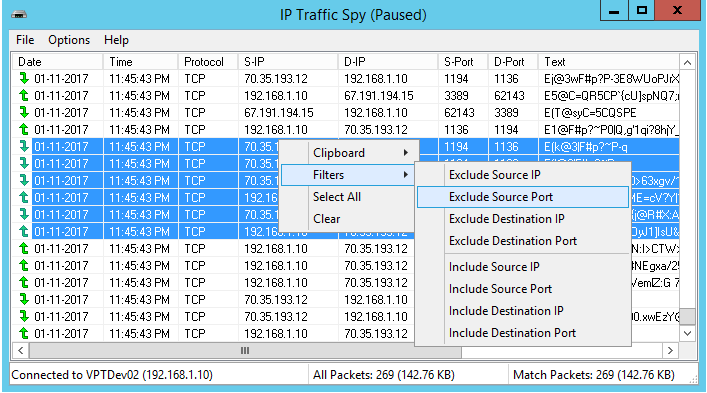 IP Traffic Spy shows a ton of data going back and forth so you'll want to find the pause button under Actions, or use the space bar. Numerous filters are also available so you can narrow down what traffic you're looking to monitor. Another tip is to use the right-click at any time to see all the available options and actions. Some of these options include clipboard, filters, details, select or deselect all.